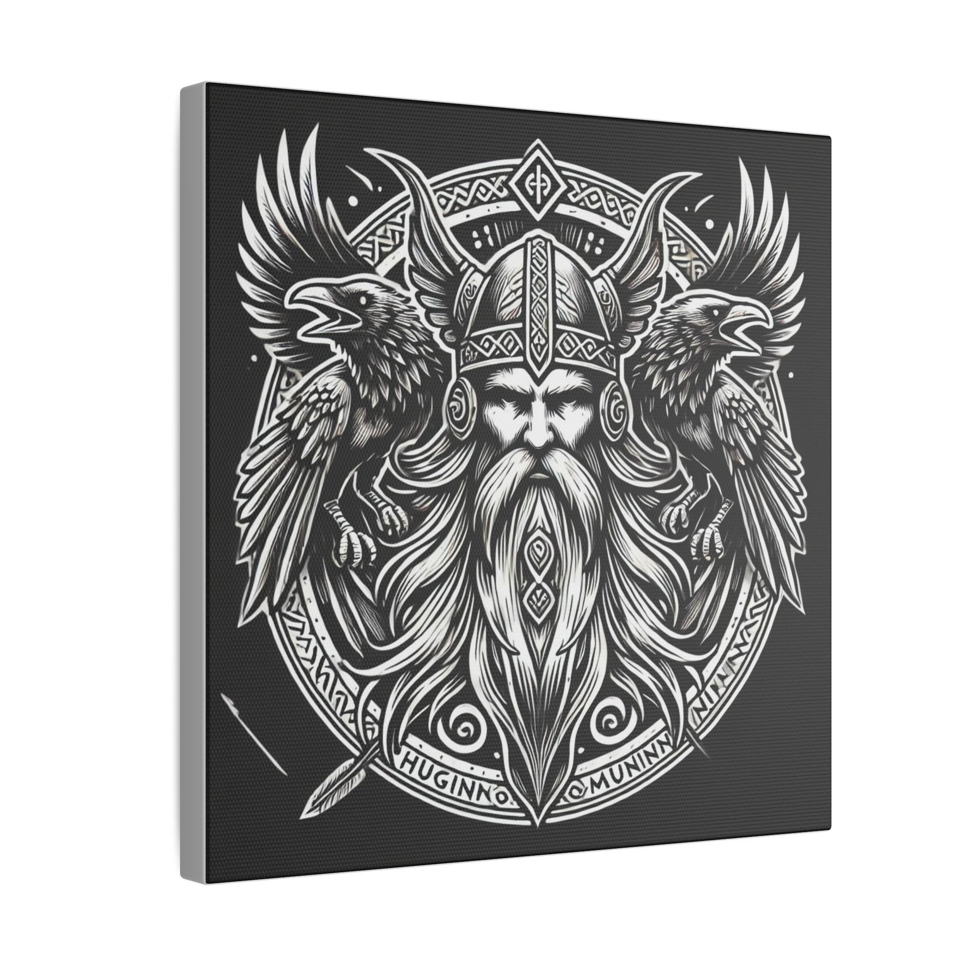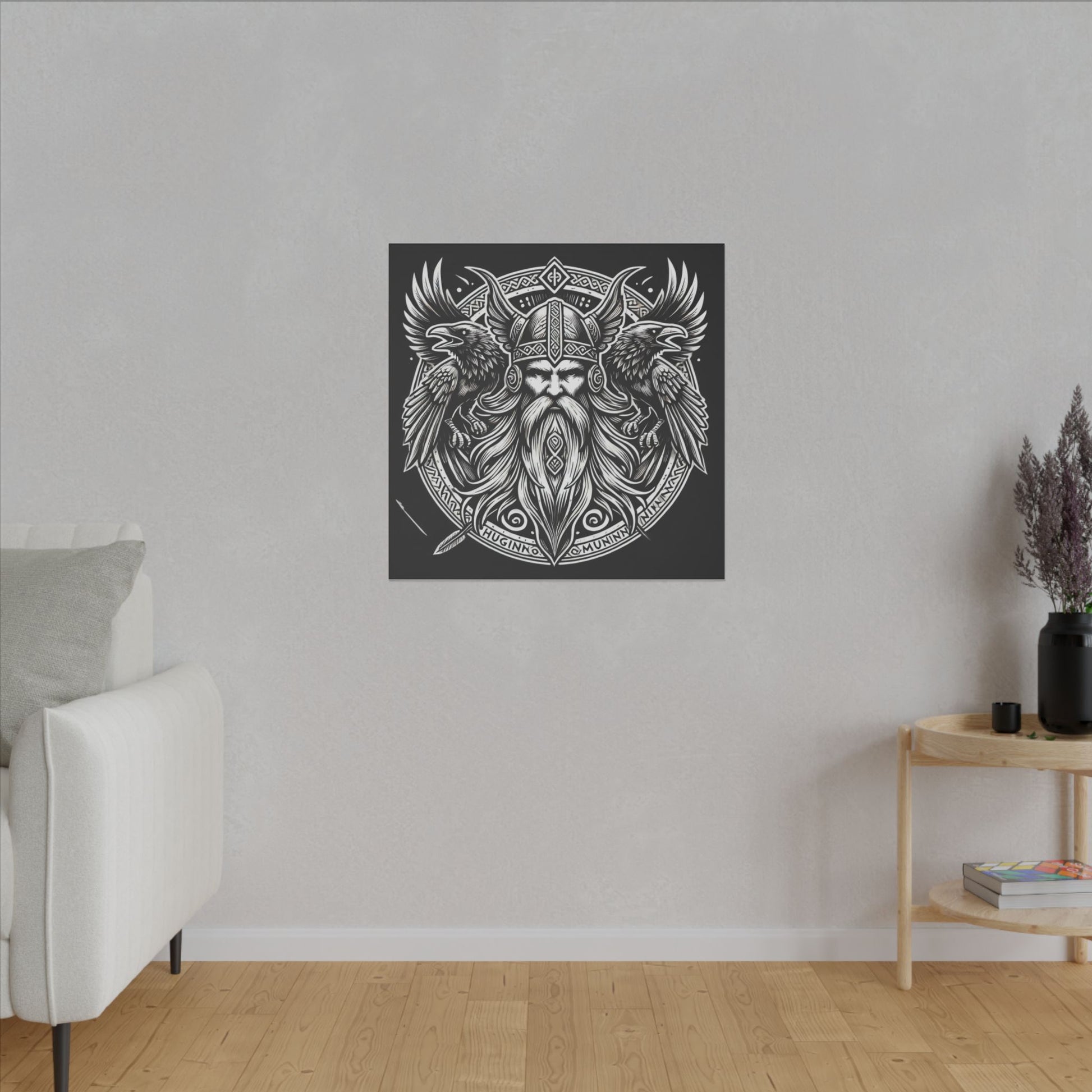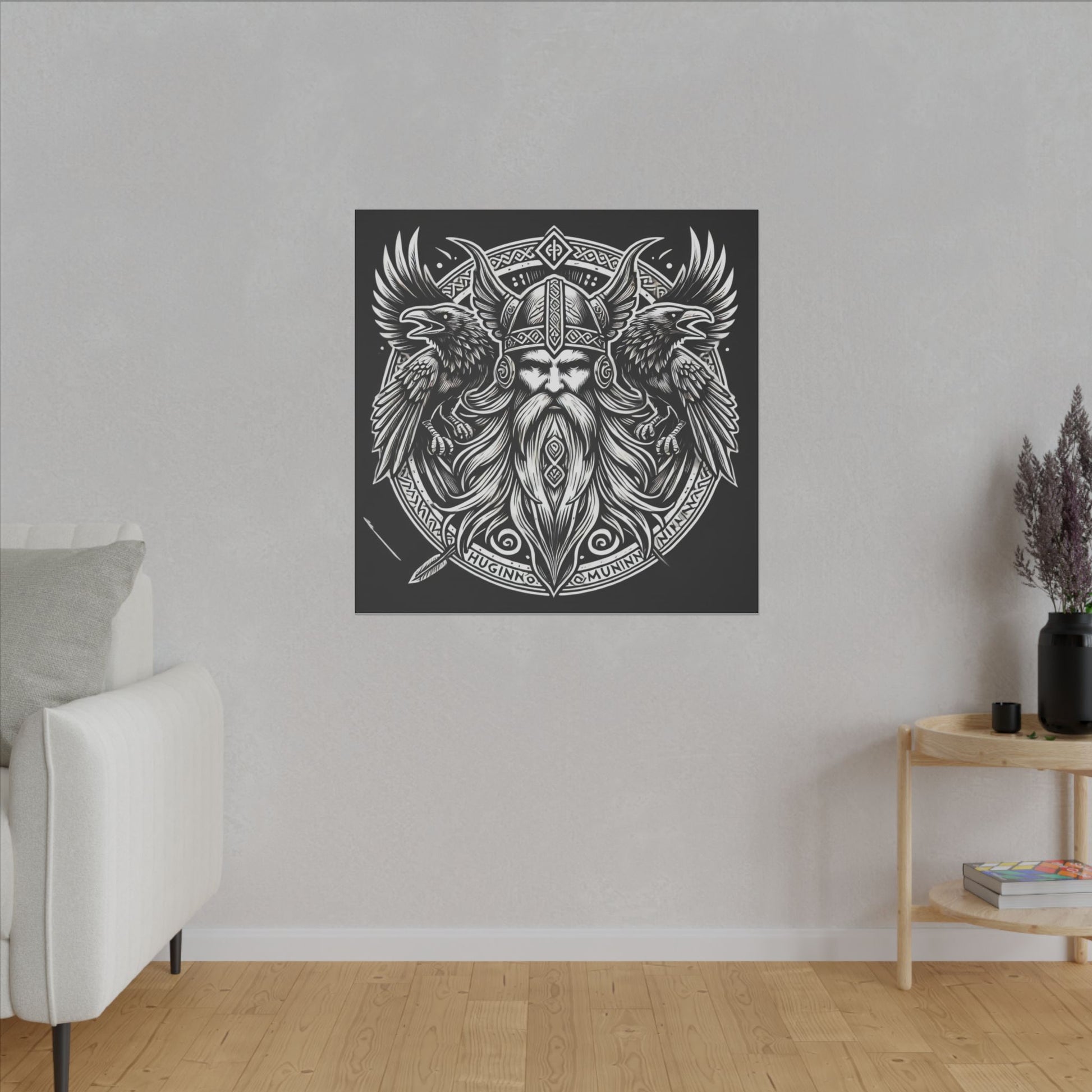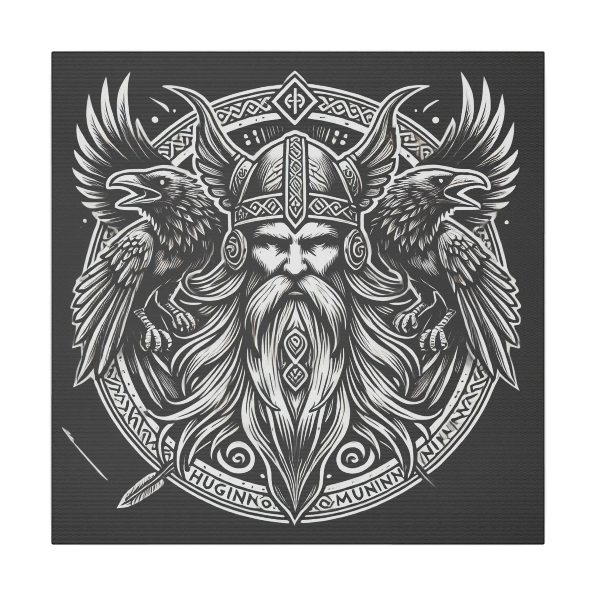 A stunning canvas print featuring the Norse God Odin with his two Ravens Huginn and Muninn, providing a mysterious and mystical vibe to your space. Perfect for fans of Norse mythology and those looking to add a unique touch to their home decor. Ideal for holidays like Halloween and celebrations like Comic-Con.