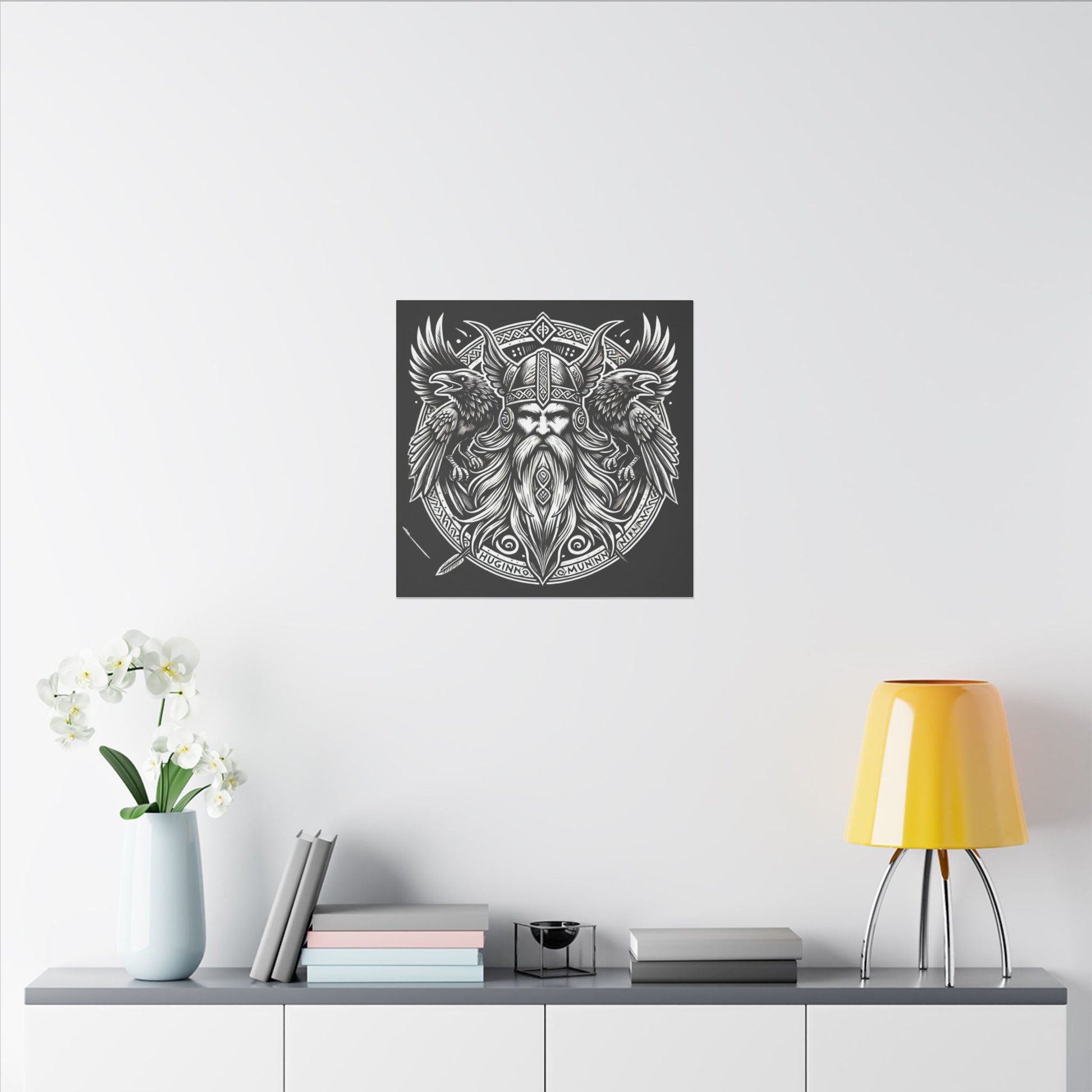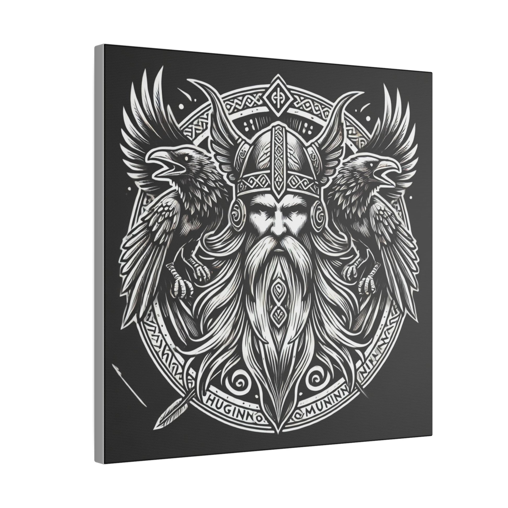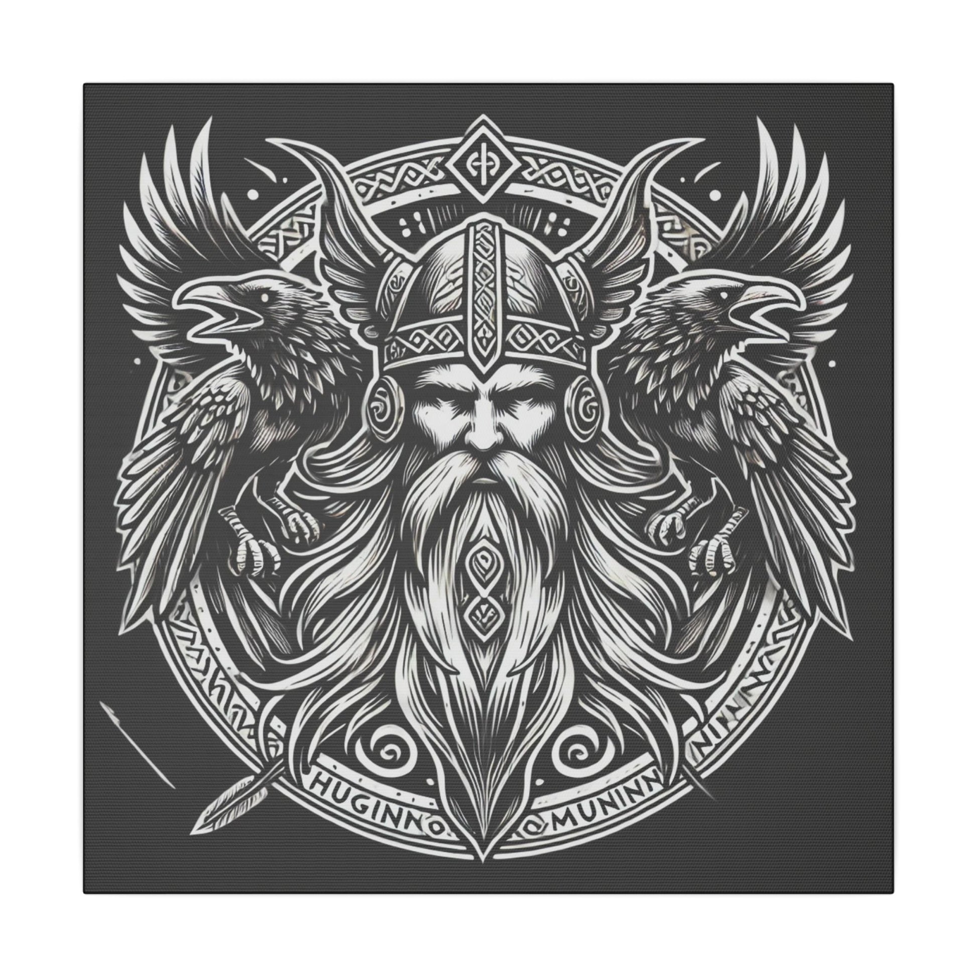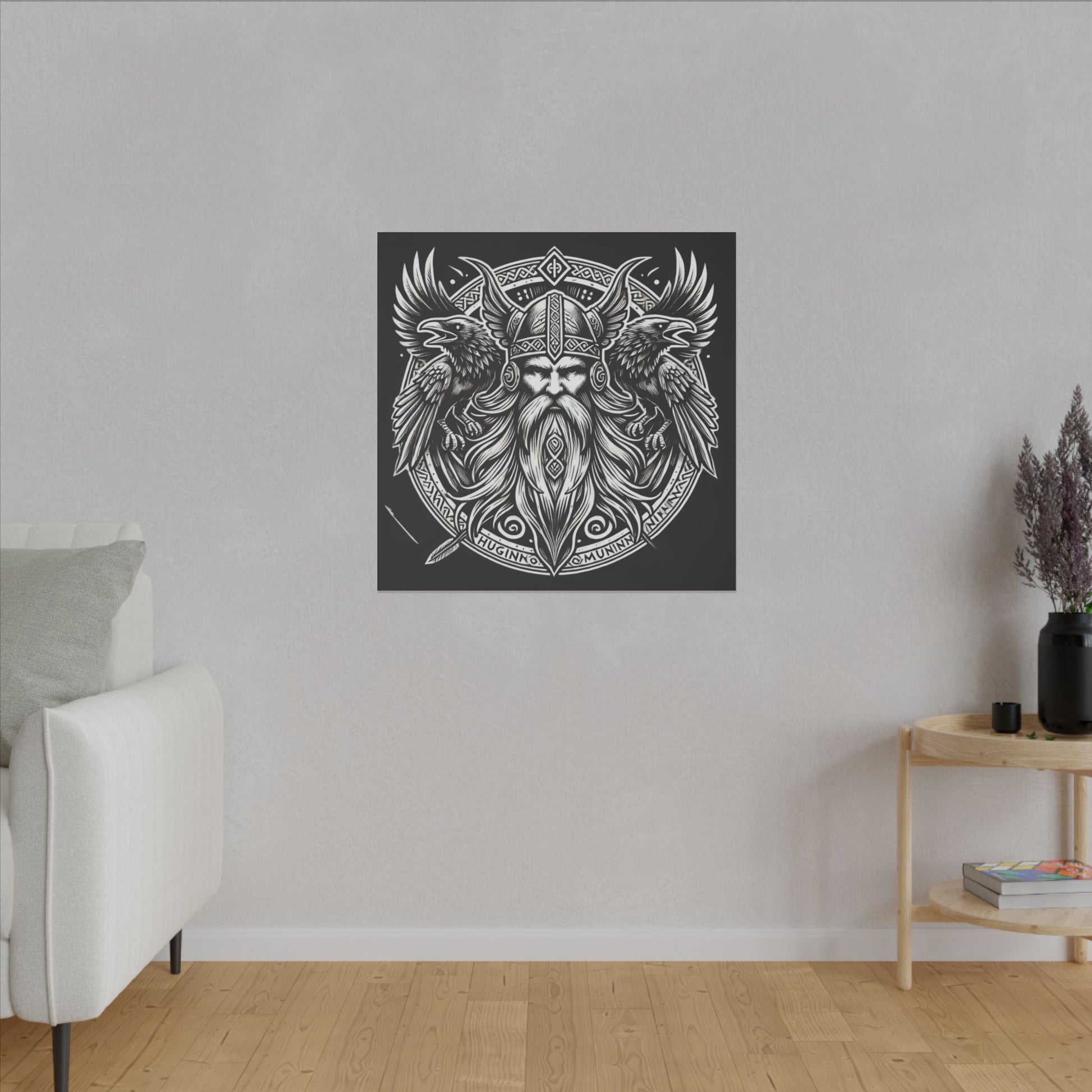 A stunning canvas print featuring the Norse God Odin with his two Ravens Huginn and Muninn, providing a mysterious and mystical vibe to your space. Perfect for fans of Norse mythology and those looking to add a unique touch to their home decor. Ideal for holidays like Halloween and celebrations like Comic-Con.